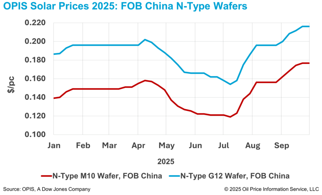 Os preços do wafer na China permaneceram estáveis esta semana, interrompendo uma sequência de quatro semanas de ganhos consecutivos. De acordo com o OPIS Solar Weekly Report divulgado em 30 de setembro, os preços FOB China para wafers M10 e G12 tipo N não mostraram mudanças semanais, mantendo-se estáveis em US$ 0,177/pc e US$ 0,216/pc, respectivamente.