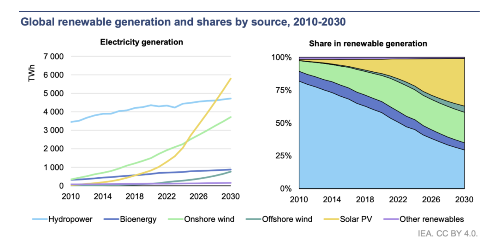 Em outras partes do relatório, prevê-se que as energias renováveis se tornem a maior fonte global de energia até o final da década, usada para 43% da geração de eletricidade até 2030, com a energia solar ultrapassando a energia hidrelétrica como a maior fonte de energia renovável.