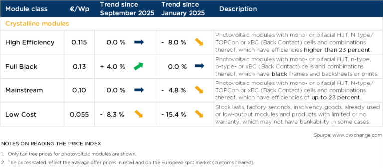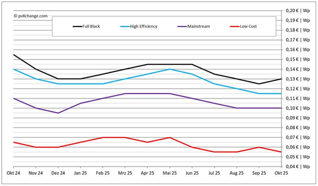 Os preços dos módulos em todas as classes de tecnologia estão mostrando ligeiros aumentos e quedas, sem uma tendência clara de longo prazo. As flutuações de preços refletem, em grande parte, a dinâmica atual da demanda: o setor de pequenas instalações está encolhendo, levando ao declínio das vendas de módulos totalmente pretos. Os fabricantes e as empresas de EPC estão se concentrando cada vez mais em projetos fotovoltaicos de média e grande escala, onde os módulos de alta eficiência estão ganhando força, embora a concorrência de preços permaneça intensa.
