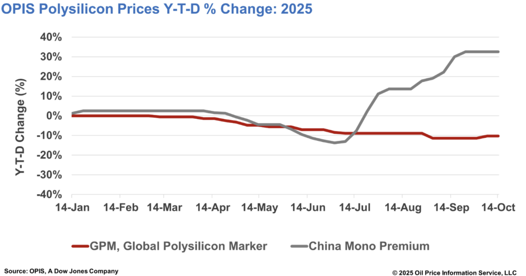 O China Mono Premium – avaliação da OPIS para polissilício monograu usado na produção de lingotes do tipo N – permaneceu inalterado semana a semana para CNY 52.200 (US$ 7.32) / kg, ou CNY 0.110 / W, de acordo com o OPIS Global Solar Markets Report divulgado em 14 de outubro.