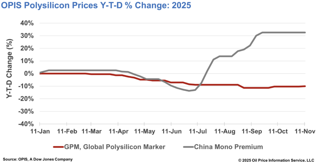 A Filial de Silício da Associação da Indústria de Metais Não Ferrosos da China revisou sua previsão para a produção de polissilício da China em novembro de 125.000 a 130.000 MT para menos de 120.000 MT. Um participante do mercado atribuiu isso a uma redução significativa da produção nas instalações de um grande fabricante no sudoeste da China devido ao aumento dos custos de eletricidade, juntamente com a manutenção de rotina em algumas bases de produção de um produtor líder de polissilício granular de reator de leito fluidizado (FBR).