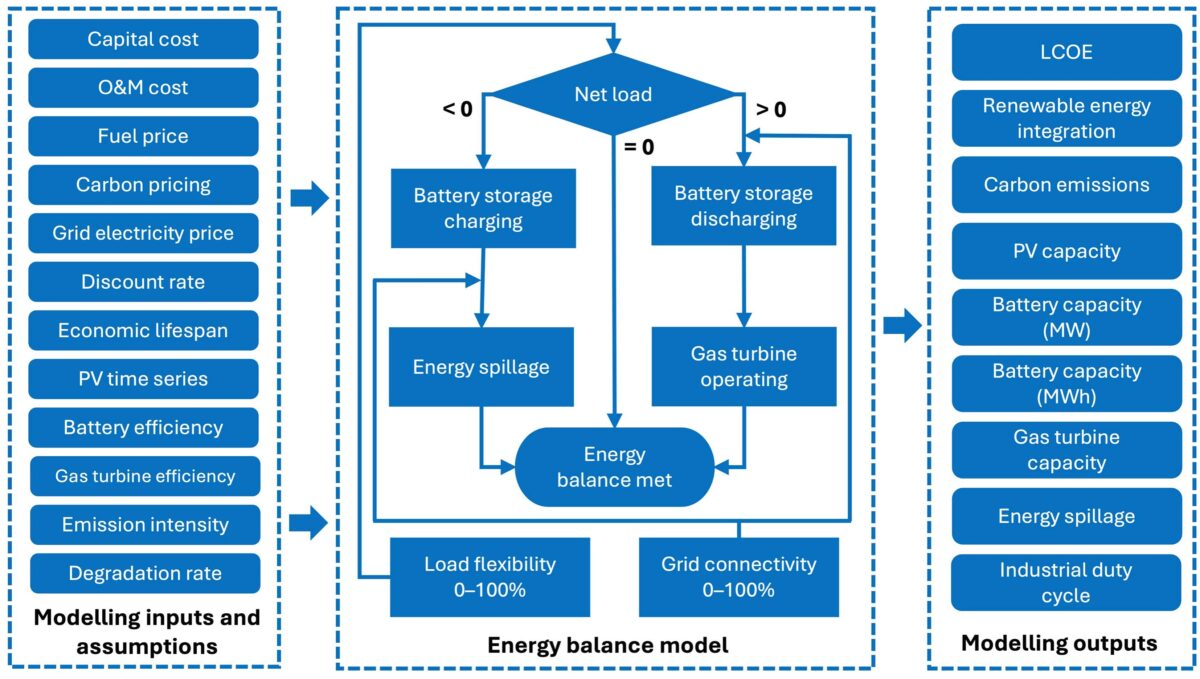 Na modelagem, assume-se uma operação industrial contínua 24 horas por dia, 7 dias por semana, alimentada por painéis fotovoltaicos e baterias instalados no local, com turbinas a gás como reserva. Uma grande operação industrial na Austrália Ocidental é utilizada como estudo de caso, onde uma carga industrial contínua de 100 MW é modelada como cenário base. Tanto os painéis fotovoltaicos quanto as baterias são modulares e podem ser facilmente dimensionados para se adequarem ao porte de qualquer operação industrial, dependendo do cenário.