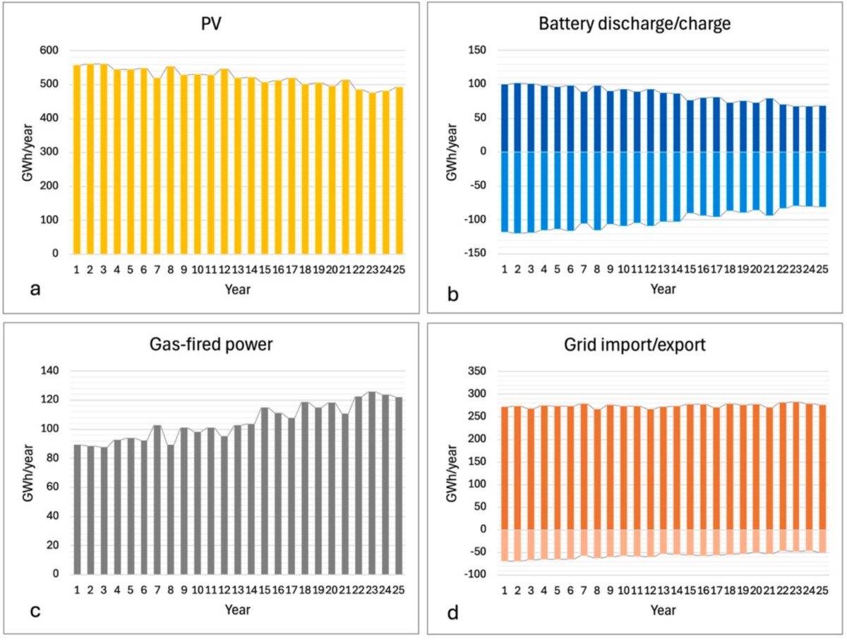 A equipe investigou três estratégias. Na estratégia de redução de custos tecnológicos, foram examinados diferentes cenários de queda nos preços das baterias fotovoltaicas; na estratégia de integração à rede, a instalação industrial foi autorizada a importar e exportar eletricidade da rede; enquanto nos casos de flexibilidade de carga industrial, a instalação poderia transferir a produção de alguns dos processos industriais para as horas de sol. A eficiência fotovoltaica foi mantida constante em 21%, a do armazenamento em baterias de íon-lítio em 85% e a da turbina a gás em 50%.