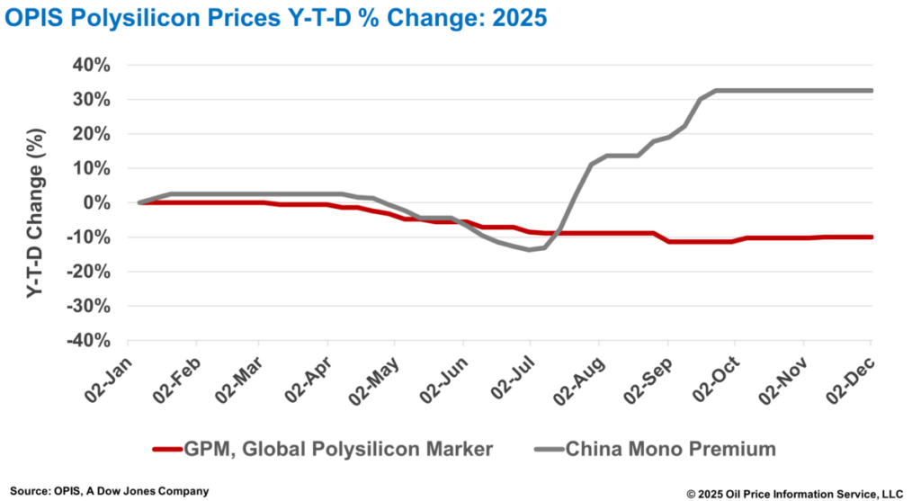 Entretanto, os fundamentos do mercado no setor de polissilício da China permanecem praticamente inalterados. O Prêmio Mono da China – avaliação da OPIS para o polissilício monocristalino usado na produção de lingotes do tipo n – permaneceu inalterado semana a semana em CNY 52,200 (US$ 7,38)/kg ou CNY 0,110/W.