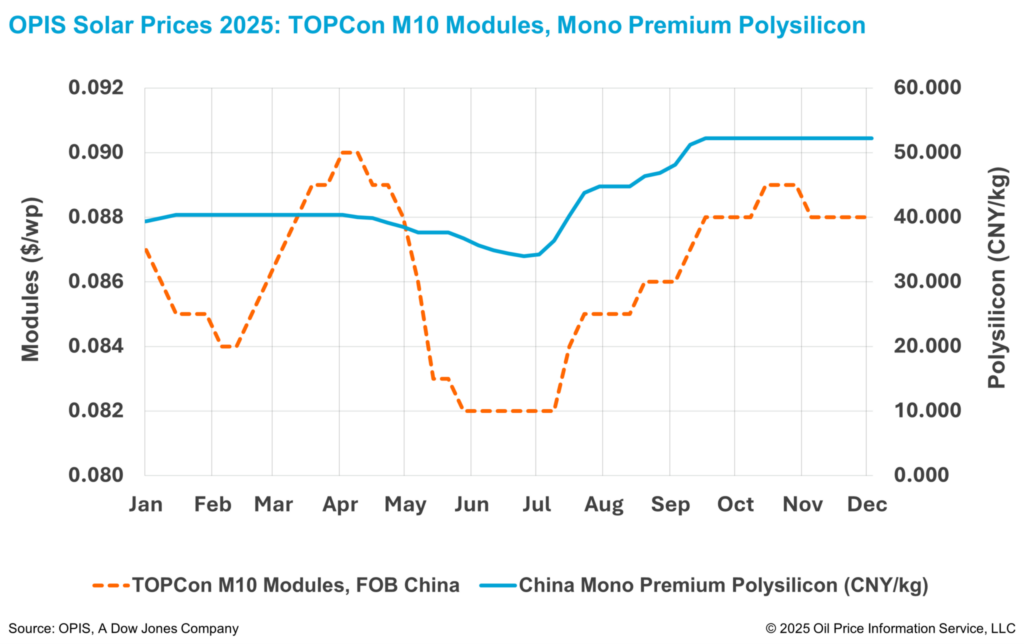 Vários participantes do mercado pesquisados pela OPIS disseram esperar que a China reduza o reembolso do imposto de exportação para produção solar em 3% a 6%, possivelmente entrando em vigor no início de 2026. A China reduziu o reembolso do imposto de exportação de 13% para 9% pela última vez em dezembro de 2024.