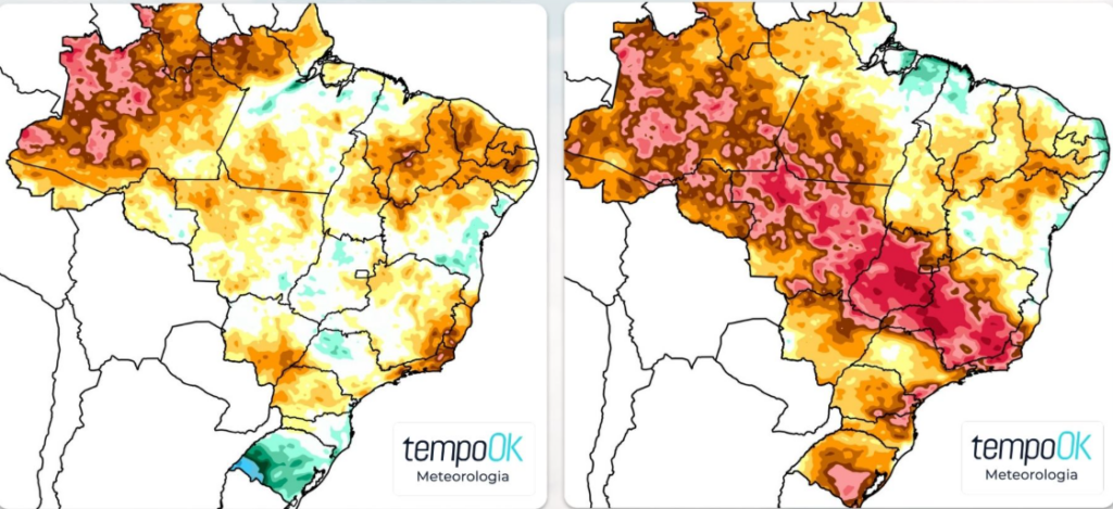 Nestas condições, predominou um cenário de chuvas abaixo da média em grande parte do Centro-Norte do país, diferentemente do que ocorreu em anos recentes com um padrão de La Niña mais clássico, como em 2021 e 2022, por exemplo.
