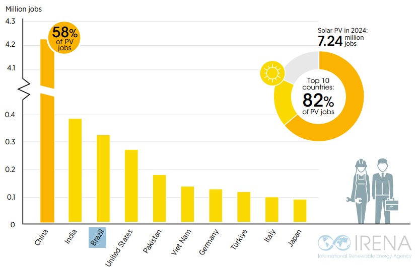 Em termos de emprego por tecnologia, a energia solar fotovoltaica (FV) mantém a liderança, devido à contínua e rápida expansão de instalações e fábricas de painéis. O setor empregou 7,3 milhões de pessoas em 2024. Os países asiáticos concentraram 75% dos empregos mundiais em FV, com a China liderando com a maior parte, com 4,2 milhões de empregos.