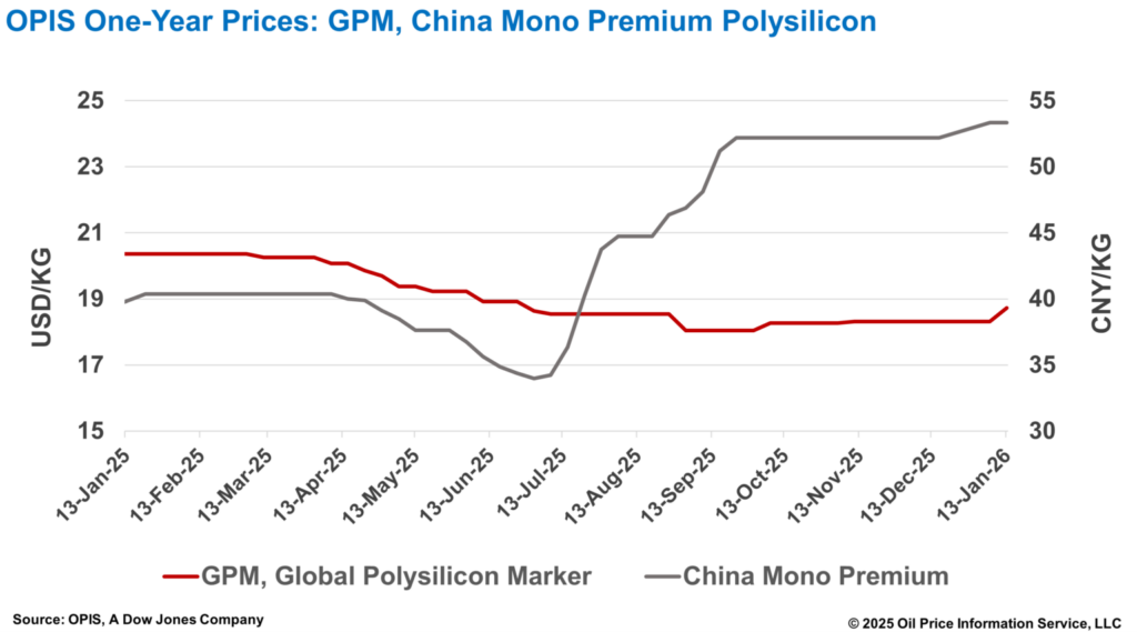 O Global Polysilicon Marker (GPM) — o índice de referência da OPIS para o polissilício produzido fora da China — foi avaliado em US$ 18,728/kg, ou US$ 0,039/W, representando um aumento de 2,23% em relação à semana anterior, de acordo com o Relatório de Mercados Globais de Energia Solar da OPIS, divulgado em 13 de janeiro.