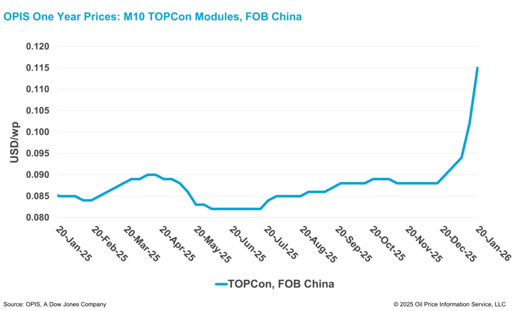 De acordo com o OPIS Global Solar Markets Report divulgado em 20 de janeiro, o Chinese Module Marker (CMM), a avaliação de referência OPIS para módulos TOPCon da China, subiu 12,75% na semana, para $ 0,115/W Free-On-Board (FOB) China.