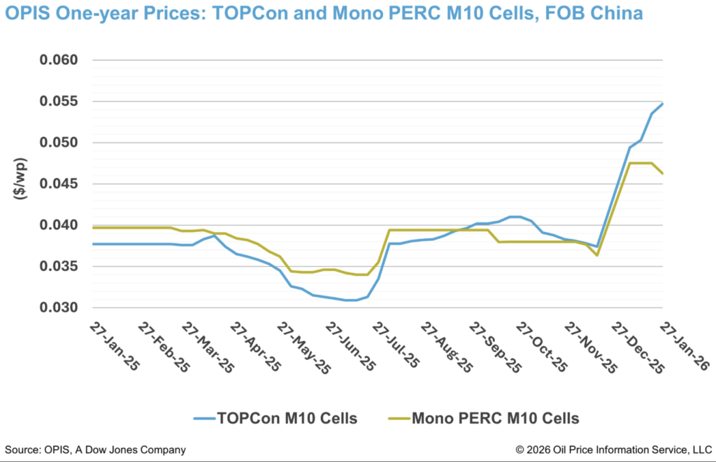 Desde o início deste ano, os preços das células TOPCon downstream dispararam 46%, enquanto os preços dos módulos TOPCon subiram quase 35%. Os aumentos de custo upstream foram mais modestos, com o OPIS China Mono Premium — avaliação do OPIS para polisilício mono-grau usado na produção de lingotes do tipo N — subindo 0,15% e os preços dos wafers do tipo N subindo cerca de 13% no mesmo período.