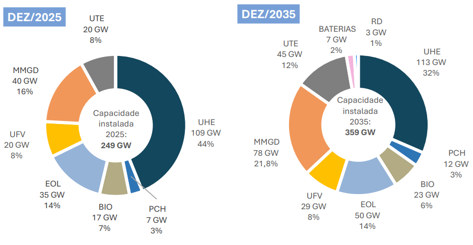 Em termos totais, o Brasil ampliará sua capacidade instalada de 249 GW em 2025 para 359 GW em 2035, uma expansão de 110 GW no período de dez anos.
