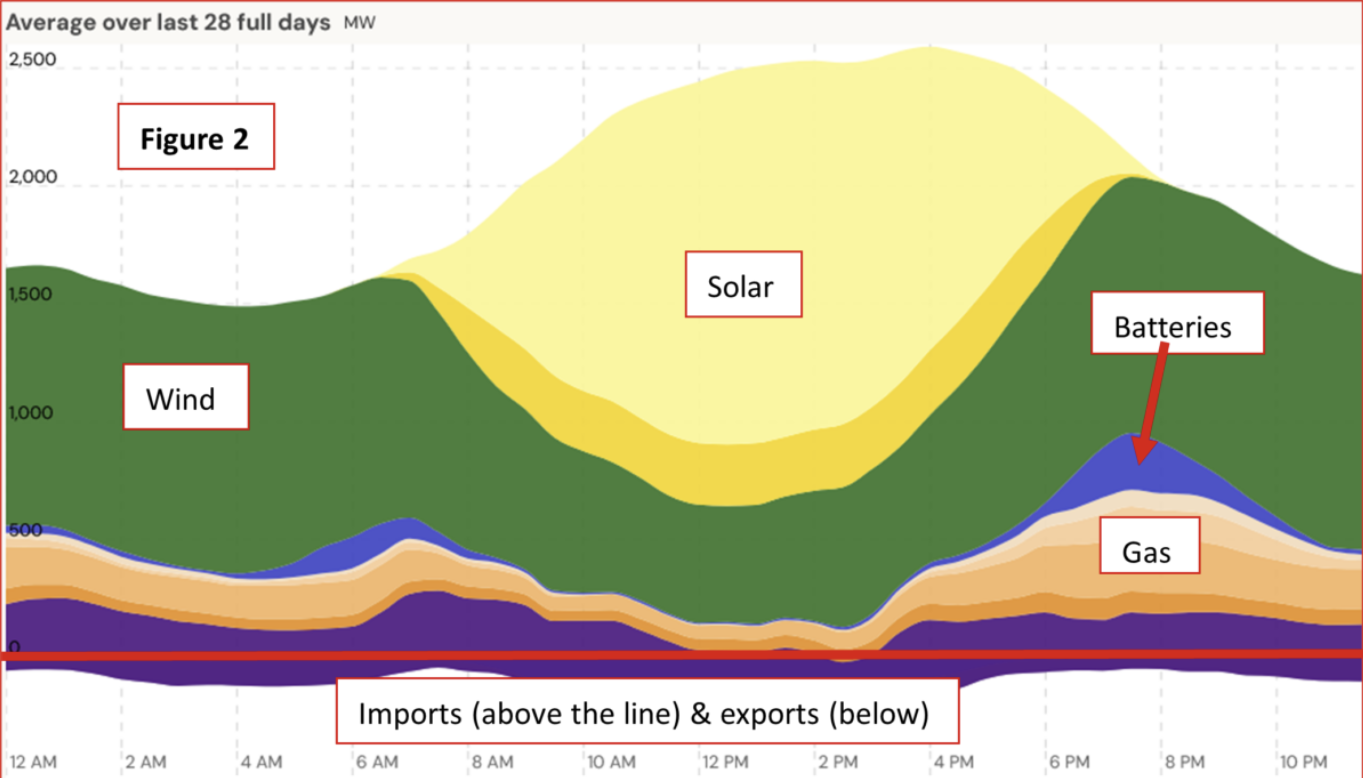 Na Austrália do Sul (Figura 2), o carvão já foi aposentado. Solar e eólica estão encaminhando para atingir 100% da demanda em média em 2027. O equilíbrio é fornecido por gás, baterias, comércio de eletricidade com estados do leste e superconstrução de energia solar e eólica, juntamente com a frequente redução de energia.