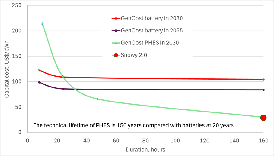 A Figura 3 mostra estimativas recentes de custo de capital feitas pela GenCost para armazenamento em função da duração. Essas estimativas são amplamente utilizadas na Austrália. Comparando baterias utilitárias no ano de 2055 com hidrelétricas por bombeamento, o ponto de interseção tem cerca de 30 horas de duração.