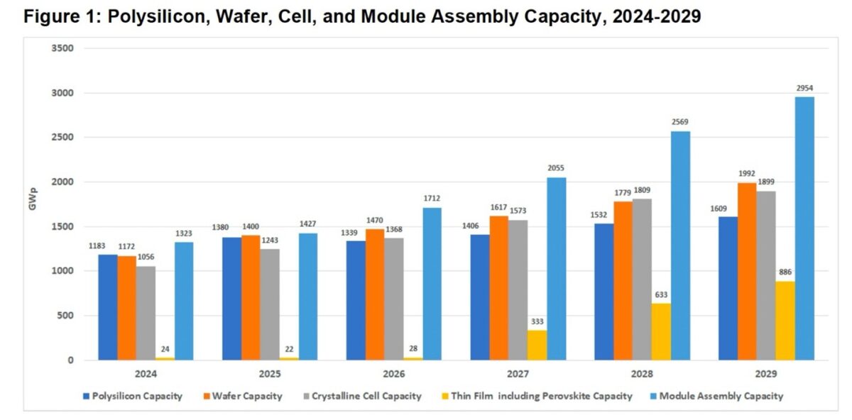 O cenário geopolítico atual exige taxas de crescimento ainda maiores para tecnologias de geração de energia renováveis, descentralizadas e acessíveis, como a solar e a eólica. A energia solar fotovoltaica tem um grande potencial de crescimento e a capacidade de produção disponível atende à crescente demanda . A adoção da energia fotovoltaica poderia praticamente dobrar imediatamente com a capacidade atual e planejada de montagem de silício policristalino, wafers, células e módulos, conforme demonstrado abaixo. Com diversas empresas começando a oferecer comercialmente módulos fotovoltaicos tandem de perovskita-Si e a promessa de eficiências estáveis na faixa de 30% até o final da década, o setor fotovoltaico entrará em uma nova fase de desenvolvimento.