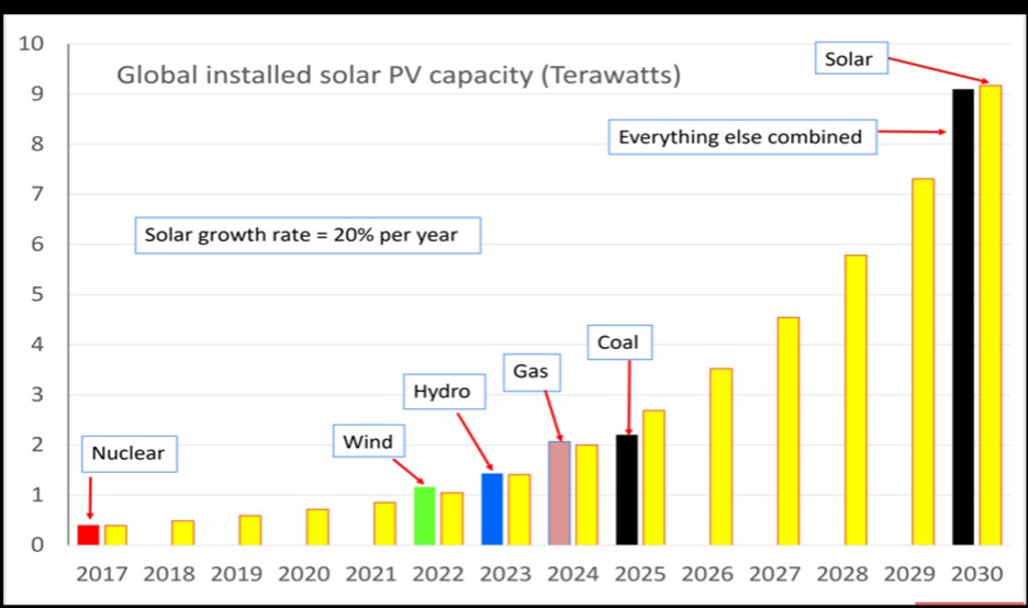 Com mais um ano recorde em 2025, as instalações globais de energia solar fotovoltaica atingiram cerca de 650 GW . Com uma taxa de crescimento anual de 20%, até o final desta década, haverá mais capacidade fotovoltaica instalada em todo o mundo do que a soma de todas as outras tecnologias de geração de eletricidade combinadas.
