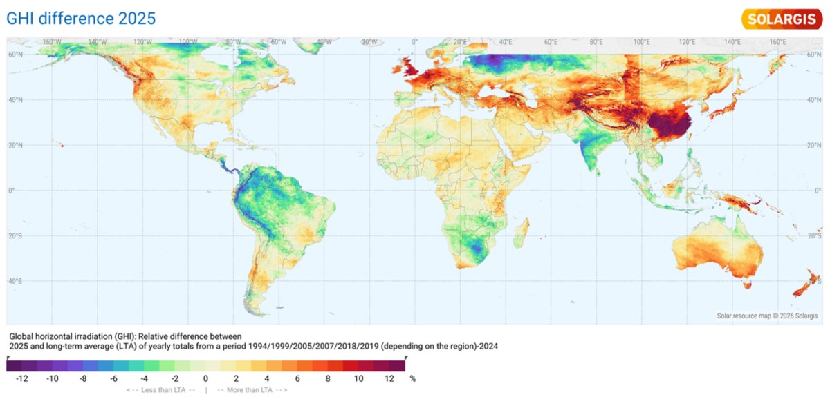 Os mapas de diferença de irradiação horizontal global de 2025, recentemente publicados pela Solargis , mostram diferenças significativas na irradiação solar global em comparação com os valores médios de longo prazo (LTA). O escurecimento e o brilho solar, bem como problemas de desempenho na geração de energia fotovoltaica, estão se tornando eventos comuns, com consequências para o desenvolvimento e financiamento de projetos de usinas fotovoltaicas de grande escala. A irradiação solar global apresentou extremos positivos e negativos no ano passado, com os maiores desvios positivos chegando a 20% acima do LTA. A visão geral dos recursos solares nos mapas, que antes era apresentada com um código de cores padrão com variação de -12% a +12%, teve que ter a faixa expandida para -14% a +14% devido a uma anomalia extrema na China. A Solargis apresentou os seguintes destaques para essas variações: