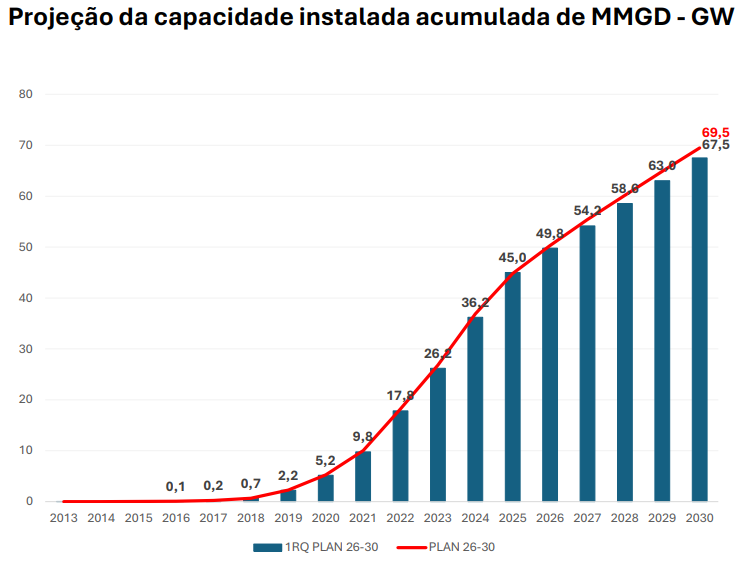 As projeções de crescimento da geração distribuída também foram revistas para baixo, com a expectativa de que a capacidade acumulada alcance 67,5 GW em 2030, em vez dos 69,5 GW previstos anteriormente (2,8%).