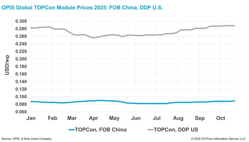 O carregamento do 4º trimestre de 2025 subiu 1,14%, para US$ 0,088/W, acompanhando indicações spot mais firmes, com preços de mercado mais altos variando de US$ 0,086-0,091/W.