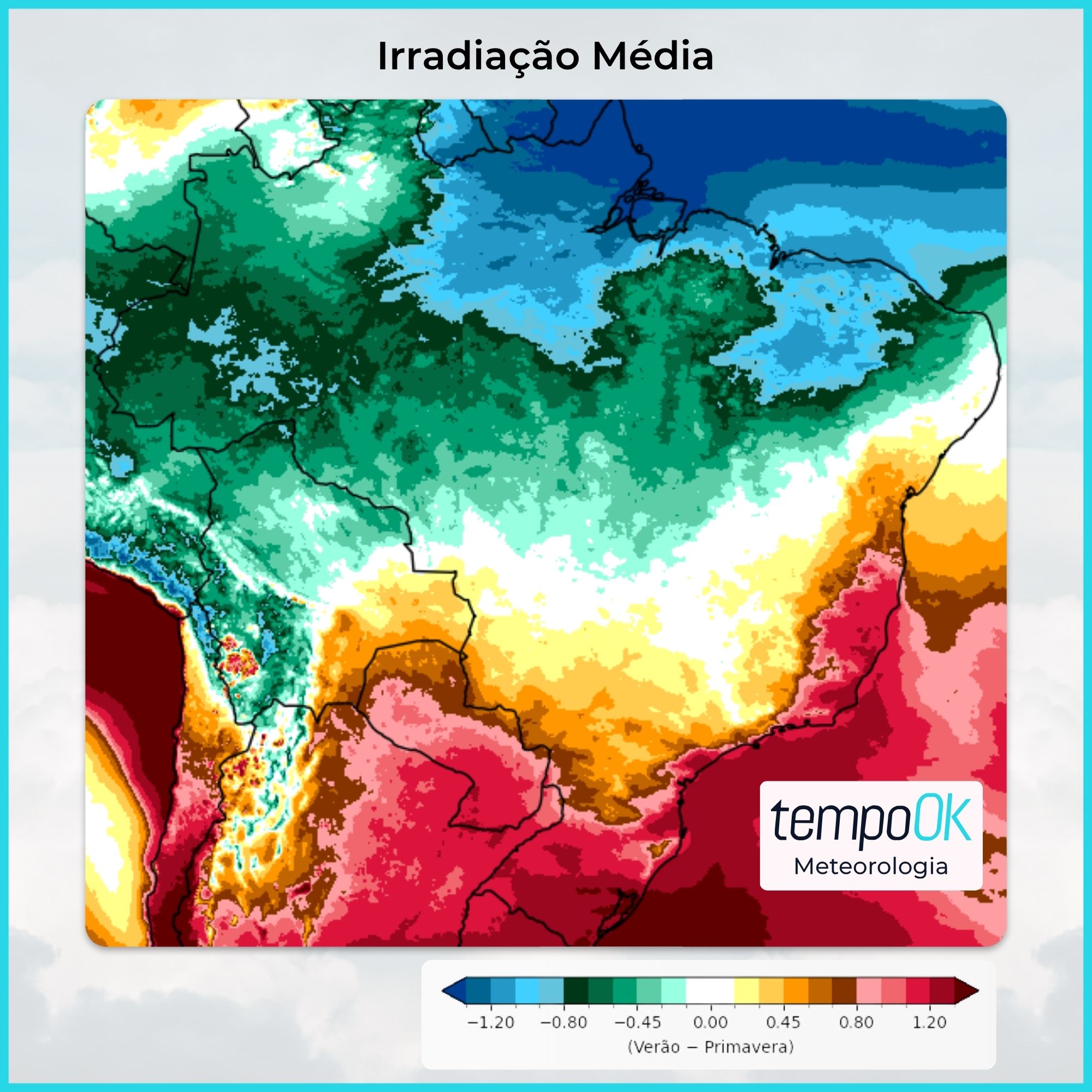 Na Figura 3 podem ser resumidas as diferenças climatológicas da irradiação solar diurna média entre a primavera e o verão. No verão, sistemas transientes chegam com menor frequência às regiões Sul e Sudeste, especialmente sobre o mar e a costa, resultando em menor nebulosidade e, consequentemente, maior irradiação solar nessas áreas. Por outro lado, na região amazônica e Norte do Brasil, o verão é caracterizado pelo aumento do transporte de umidade e da atividade convectiva local, o que eleva a nebulosidade e, portanto, reduz a irradiação em superfície.