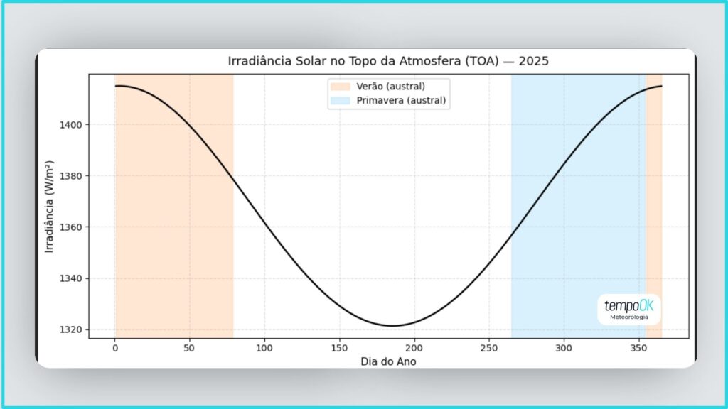 Para entender essa variação, é importante analisar o recurso solar desde o momento em que ele chega ao topo da atmosfera, em uma superfície horizontal ortogonal ao raio solar, a chamada irradiância no topo da atmosfera, ou TOA (Top of Atmosphere).