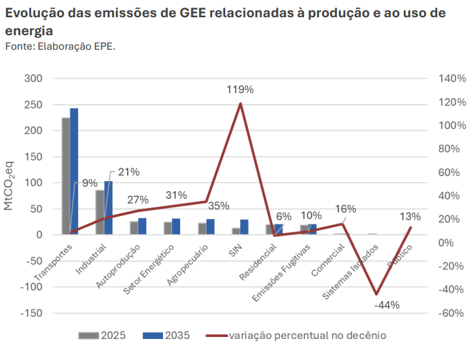 Por outro lado, as emissões no Sistema Interligado Nacional (SIN) devem aumentar em 119% até 2035, com a entrada de usinas térmicas a gás, chegando a 30,37 MtCO2eq. Ainda assim, o SIN representará apenas 6% das emissões totais do setor em 2035, graças à alta participação de fontes renováveis.