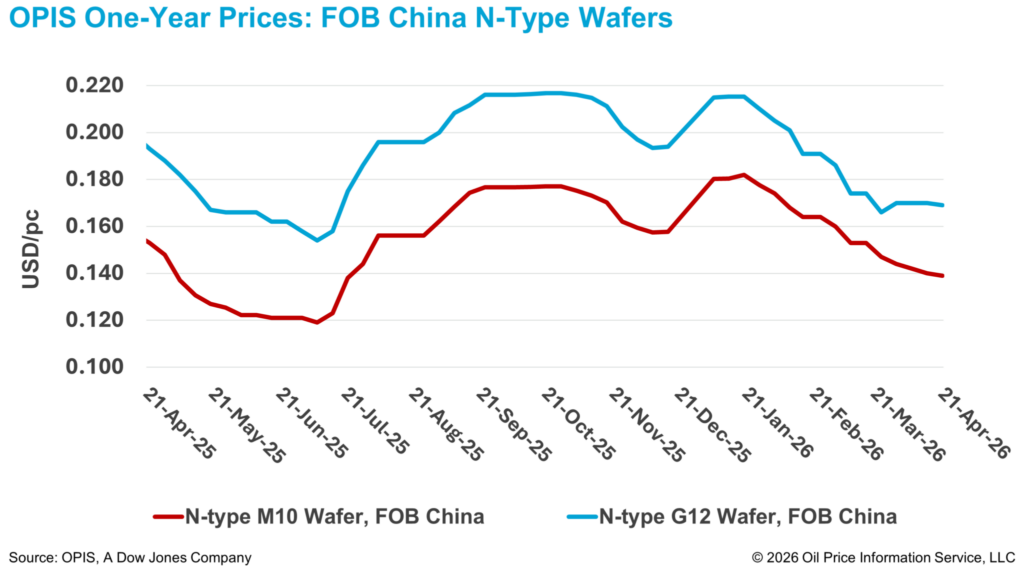 De acordo com o OPIS Global Solar Markets Report divulgado em 21 de abril, os preços das wafers N-type M10 e N-type G12 da China Free-On-Board (FOB) caíram para $0,139/pc e $0,169/pc, refletindo quedas semanais de 0,71% e 0,59%, respectivamente.